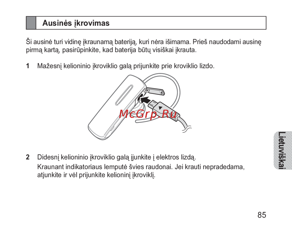 Ši ausinė turi vidinę įkraunamą bateriją, kuri nėra išimama. Prieš naudodami ausinę