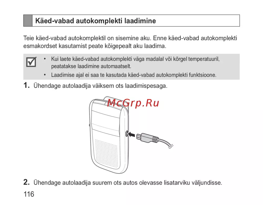 Laadimise ajal ei saa te kasutada käed-vabad autokomplekti funktsioone.