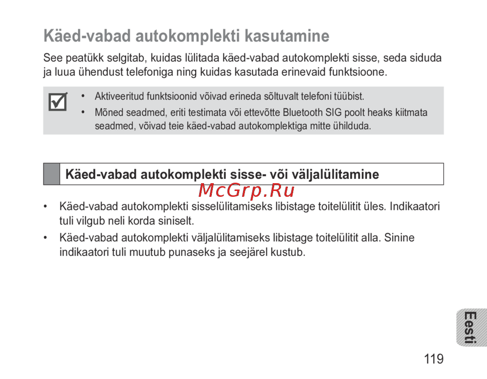 - Käed vabad autokomplekti sisse või väljalülitamine p.121