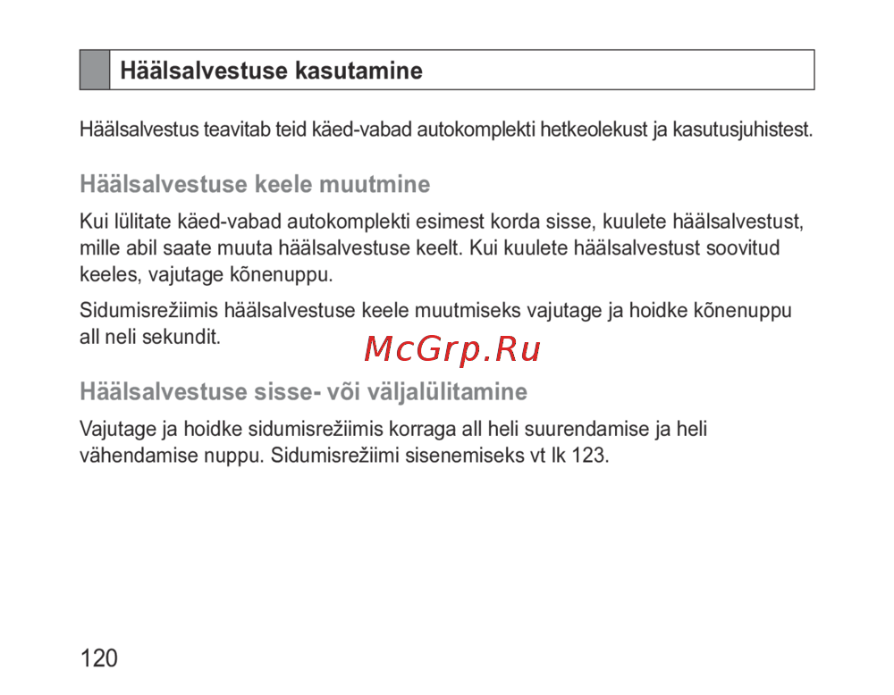 - Käed vabad autokomplekti sidumine ja ühenduse loomine p.124