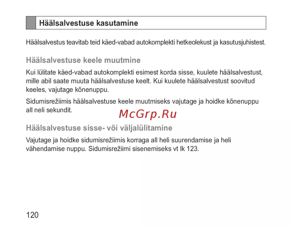 Häälsalvestus teavitab teid käed-vabad autokomplekti hetkeolekust ja kasutusjuhistest.