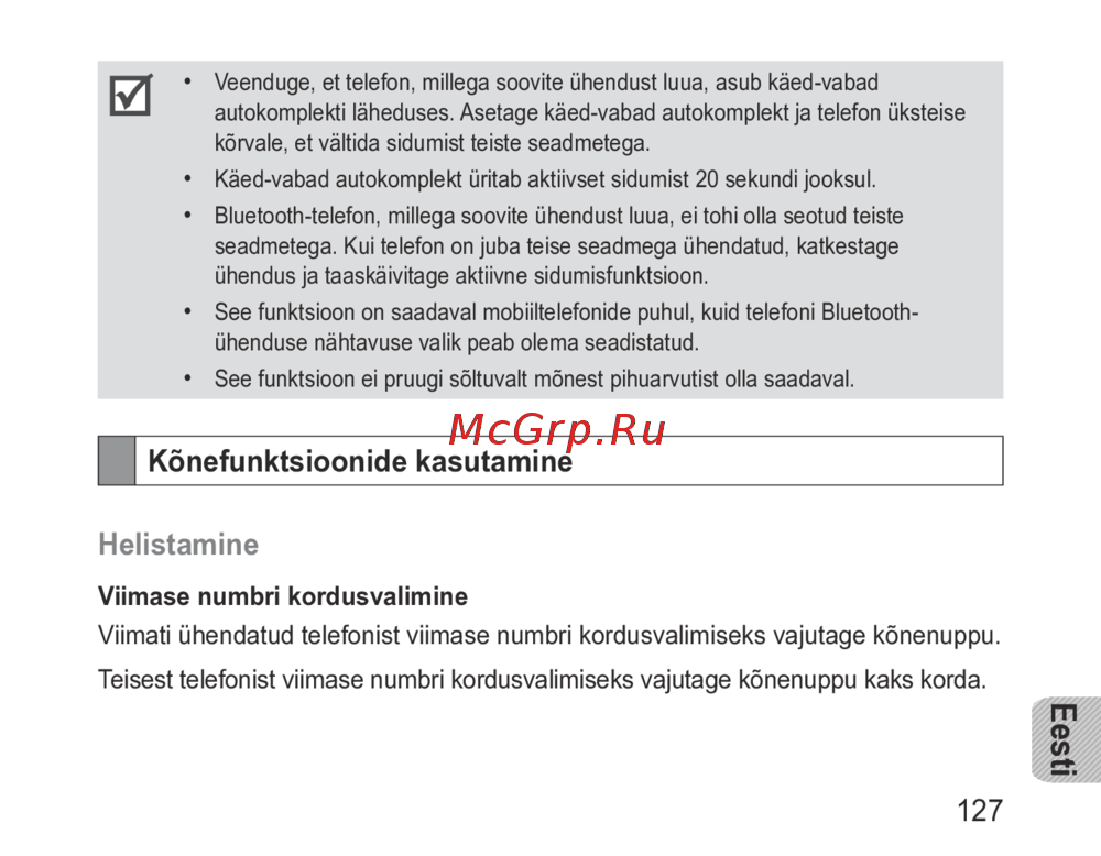 - Käed vabad autokomplekti sidumine ja ühenduse loomine p.124