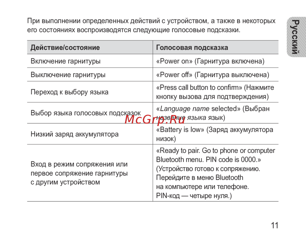 его состояниях воспроизводятся следующие голосовые подсказки.