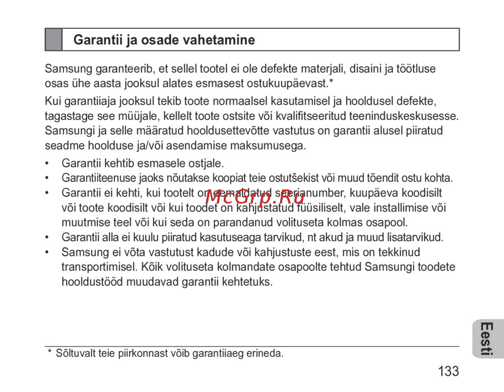 Samsungi ja selle määratud hooldusettevõtte vastutus on garantii alusel piiratud