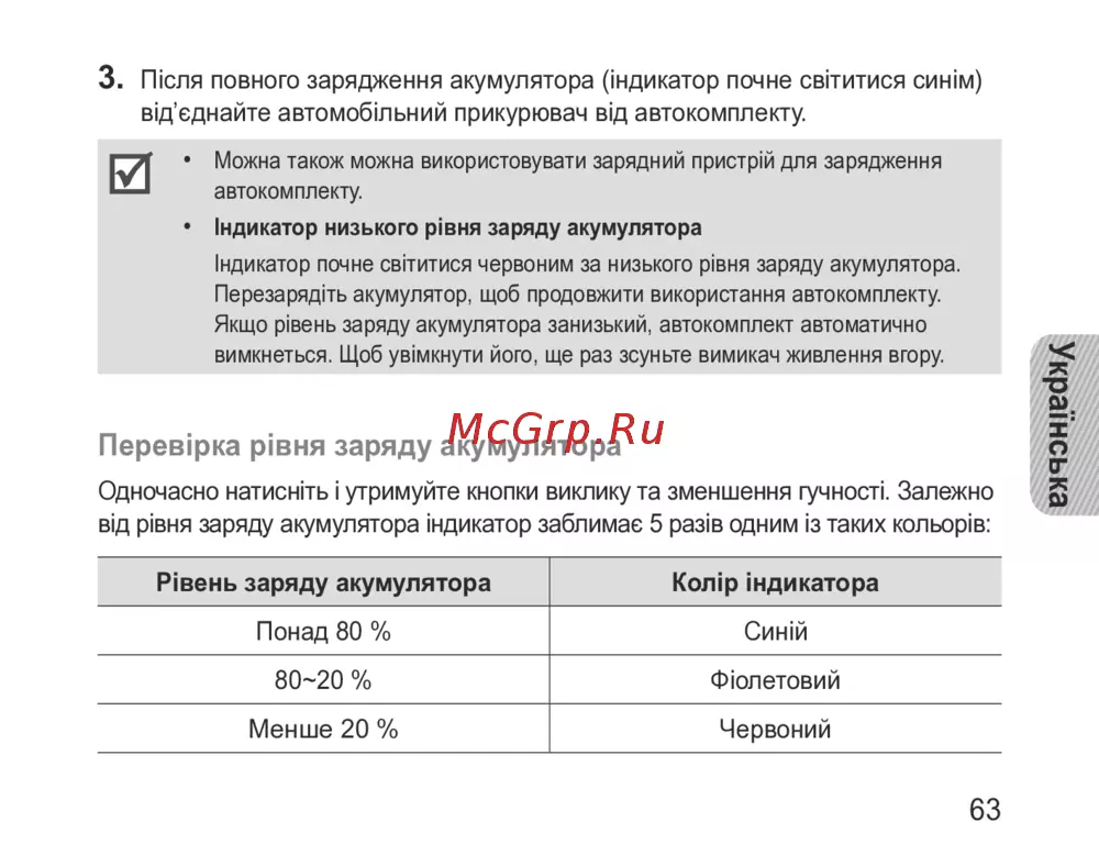 від рівня заряду акумулятора індикатор заблимає 5 разів одним із таких кольорів: