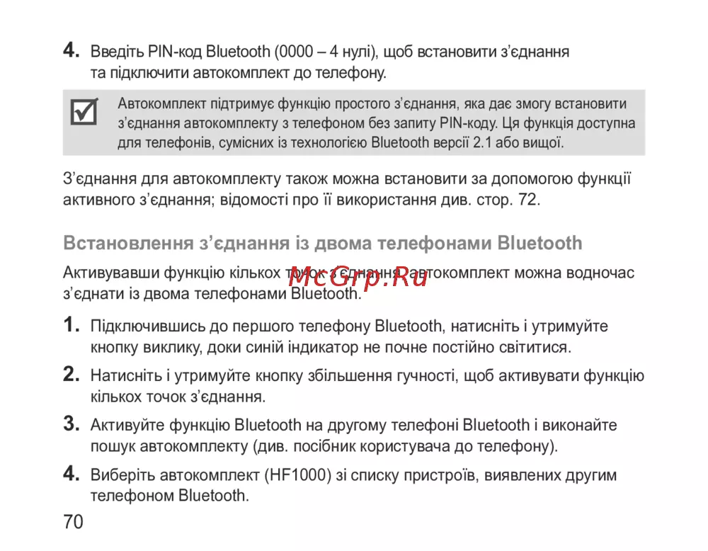 з’єднання автокомплекту з телефоном без запиту PIN-коду. Ця функція доступна