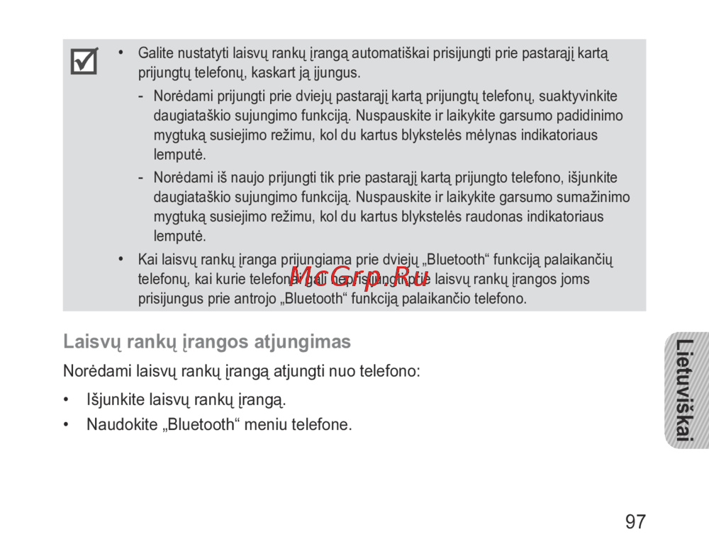 - Laisvų rankų įrangos susiejimas ir prijungimas p.96