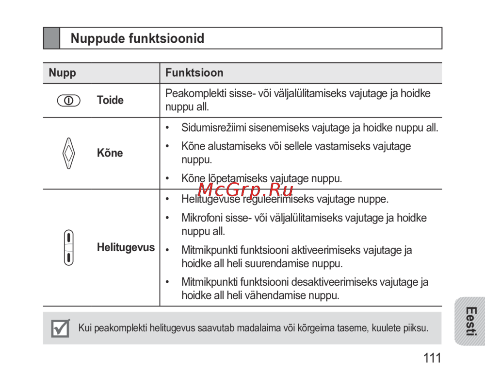 Kui peakomplekti helitugevus saavutab madalaima või kõrgeima taseme, kuulete piiksu.