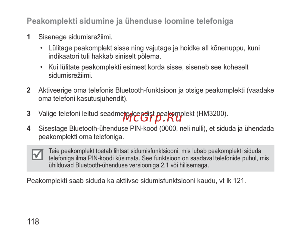 - Peakomplekti sidumine ja ühenduse loomine telefoniga p.121