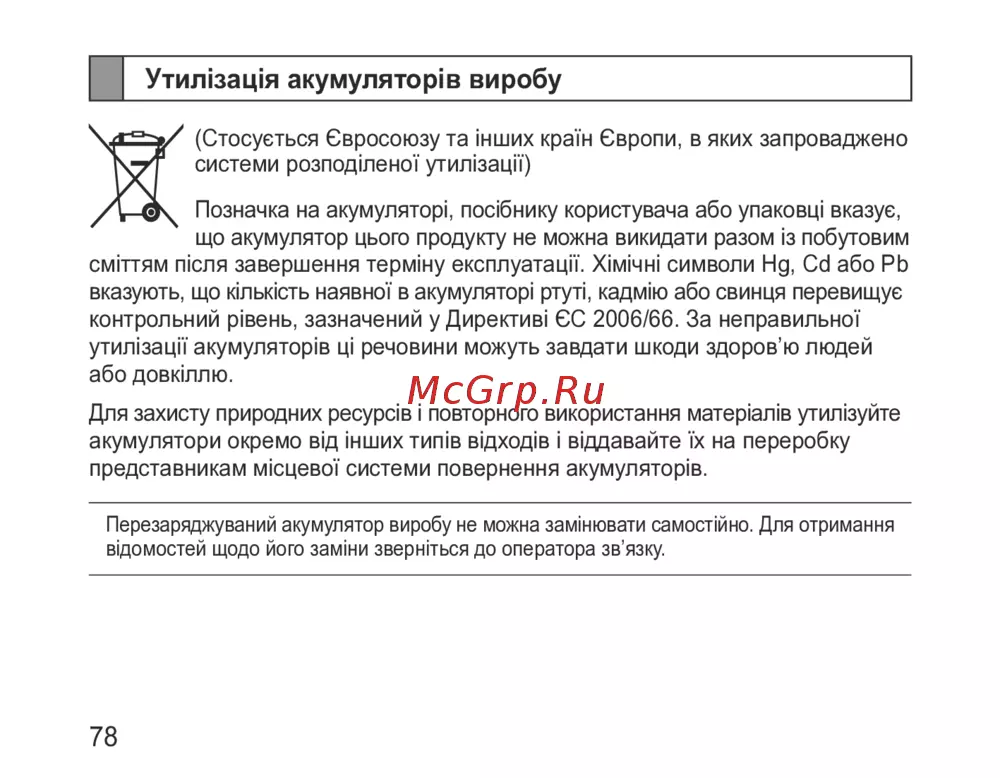 Позначка на акумуляторі, посібнику користувача або упаковці вказує,