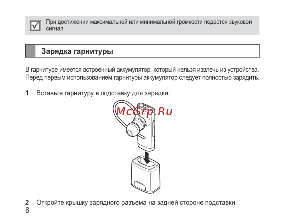 - Длительное использование гарнитуры с повышенной громкостью звука может привести к нарушению слуха перед подключением гарнитуры к аудиоисточнику настоятельно рекомендуется снижать громкость а во время разговора или прослушивания музыки устанавливать минимальную необходимую громкость p.6