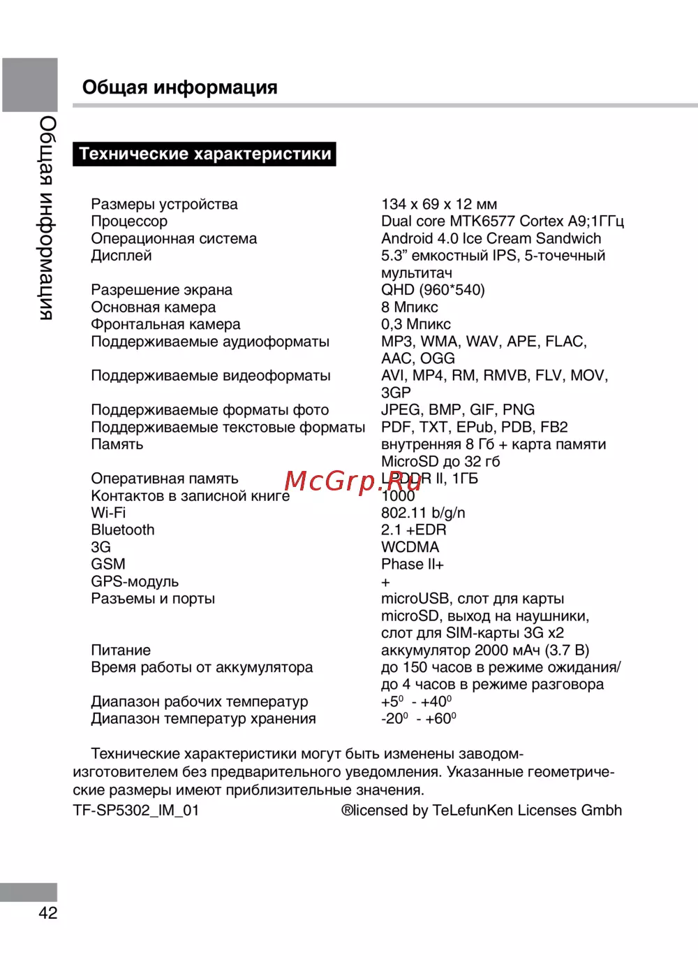 Telefunken TF-SP5302 A6 [42/43] Технические характеристики