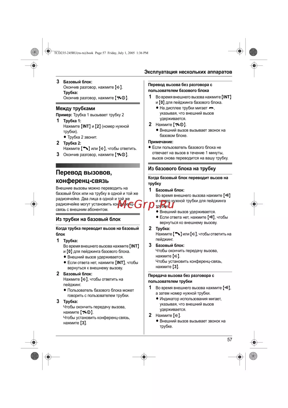 - Перевод вызова без разговора с пользователем базового блока p.57