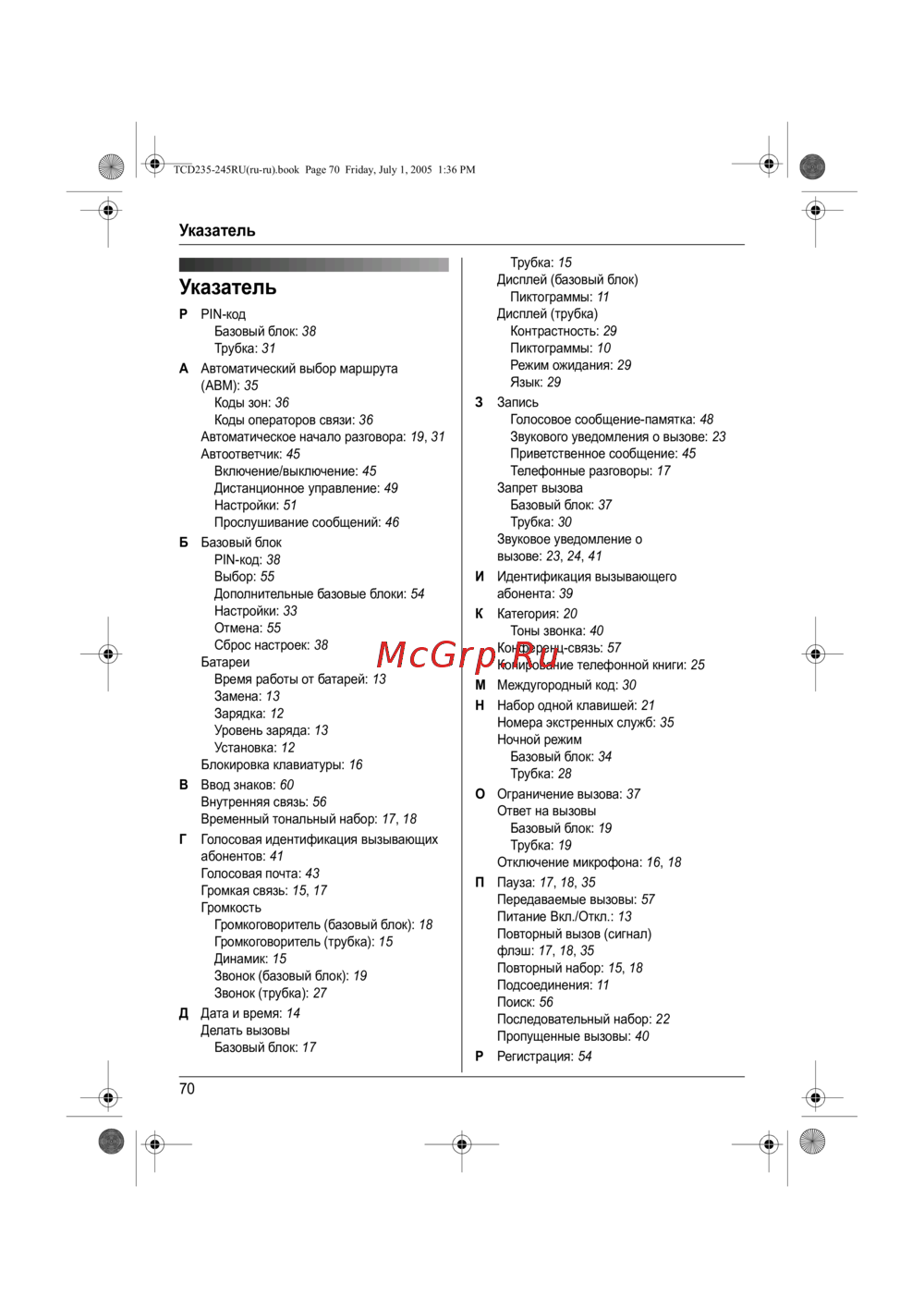 - Когда трубка переводит вызов на базовый блок p.57