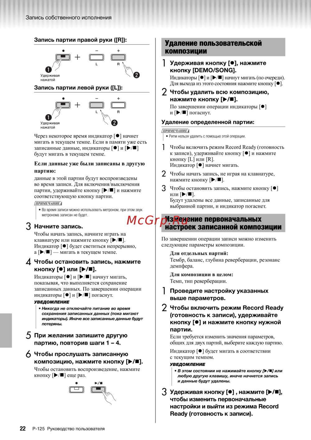 - Изменение первоначальных настроек записанной композиции p.22