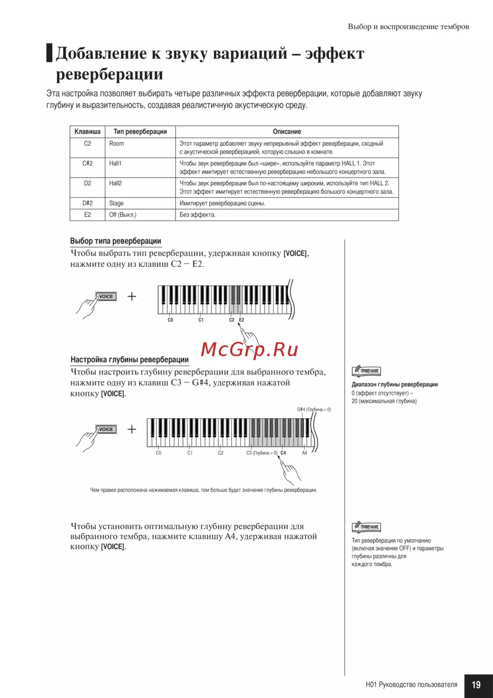 ![Yamaha H01VR(with bench) [19/32] Эта настройка позволяет выбирать четыре различных эффекта реверберации которые добавляют звуку глубину и выразительность создавая реалистичную акустическую среду](/views2/1991639/page19/bg13.png)