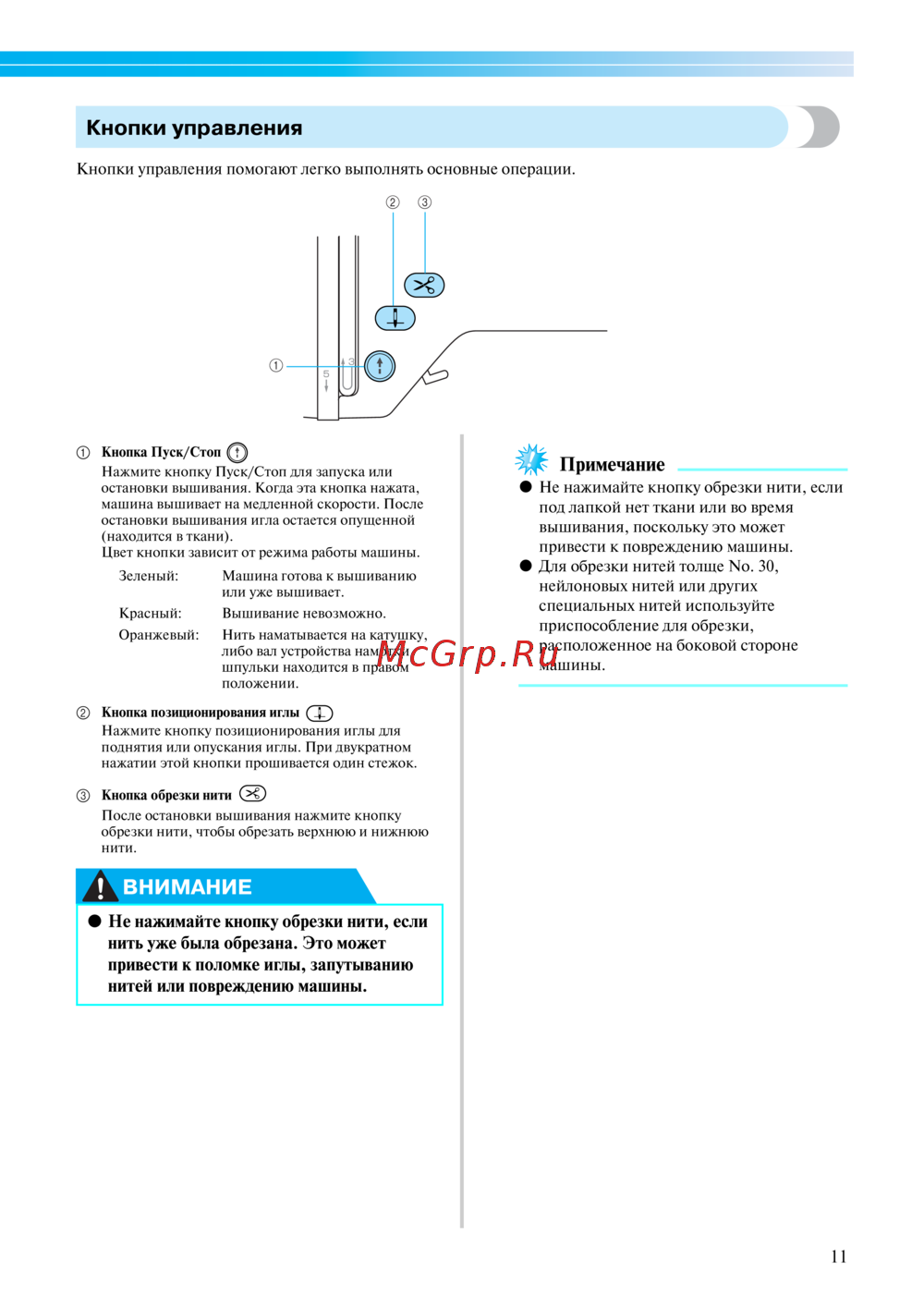 - Не нажимайте кнопку кнопка обрезки нити если нити уже были обрезаны это может привести к поломке иглы запутыванию нитей или повреждению машины не нажимайте кнопку кнопка обрезки нити если под лапкой для вышивания нет ткани или во время вышивания поскольку это может привести к повреждению машины p.60