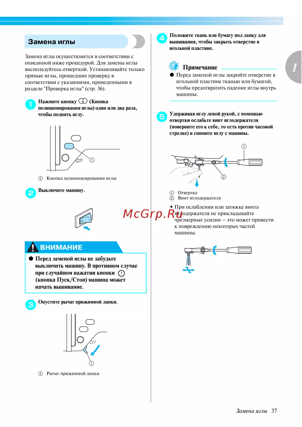 - Не бейте по игле пальцами или пяльцами это может привести к травме или поломке иглы p.50