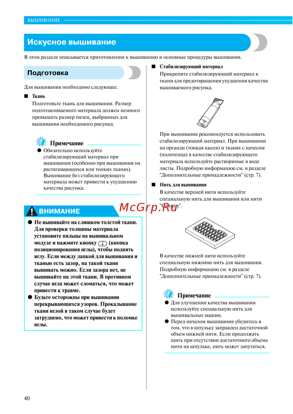 В этом разделе описывается приготовления к вышиванию и основные процедуры вышивания.