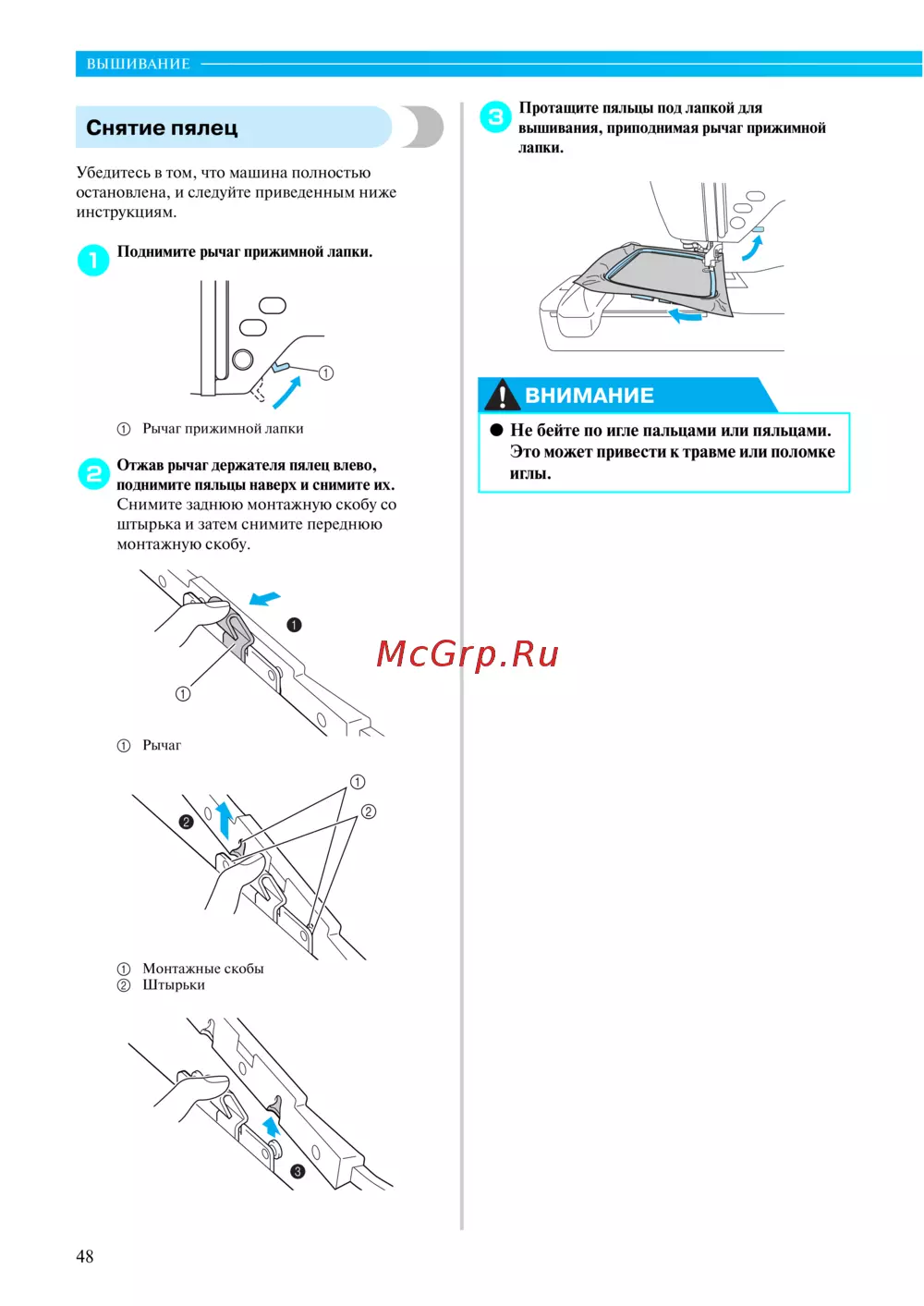 - Не бейте по игле пальцами или пяльцами это может привести к травме или поломке иглы p.50