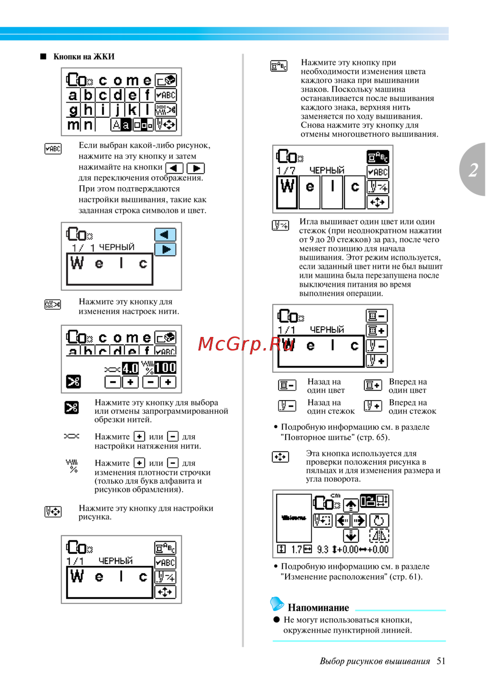 - Если данные об изменении размера и положения в нижней части экрана были записаны можно продолжить вышивание с такими же размером и расположением даже после повторного включения питания машины во время работы p.64