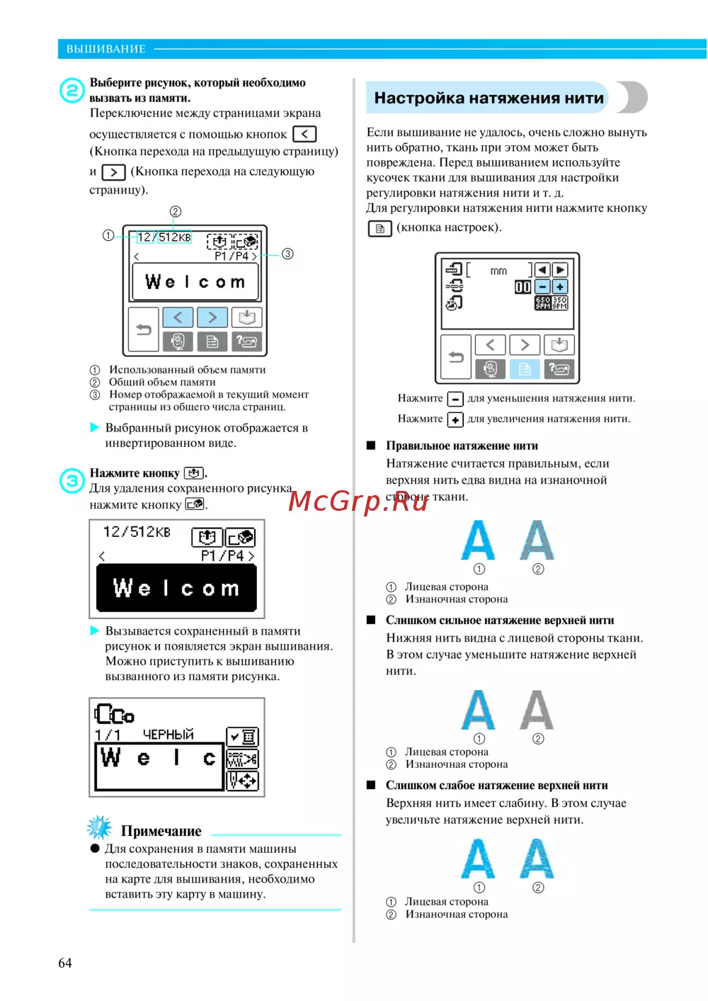 - Если данные об изменении размера и положения в нижней части экрана были записаны можно продолжить вышивание с такими же размером и расположением даже после повторного включения питания машины во время работы p.64