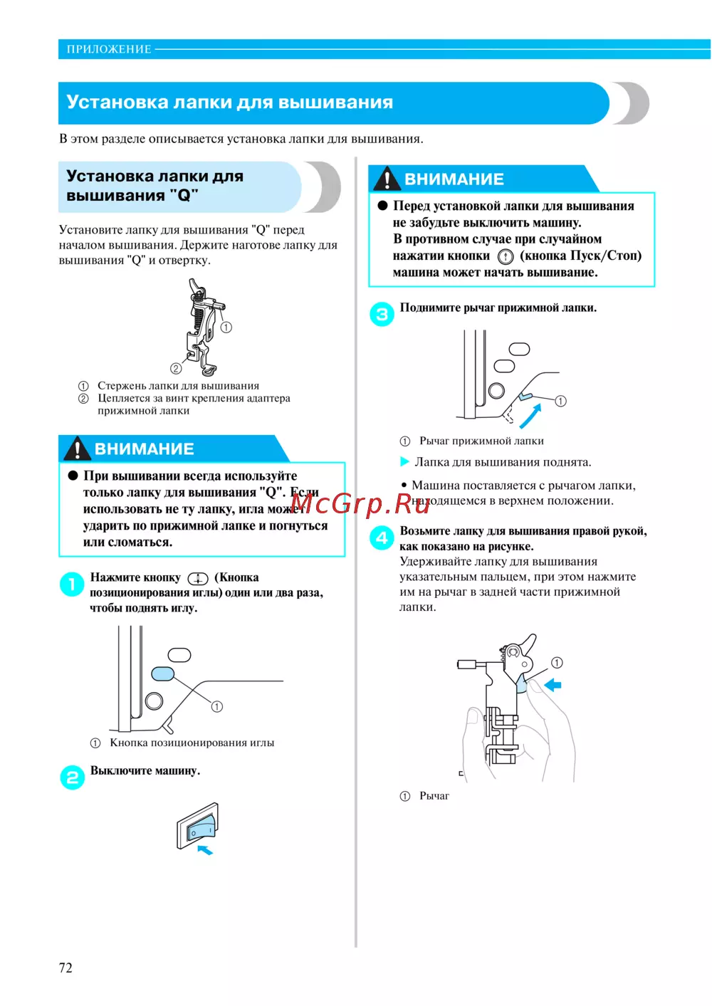 - Перед установкой лапки для вышивания не забудьте выключить машину в противном случае при случайном нажатии кнопки кнопка пуск стоп машина может начать вышивание p.74