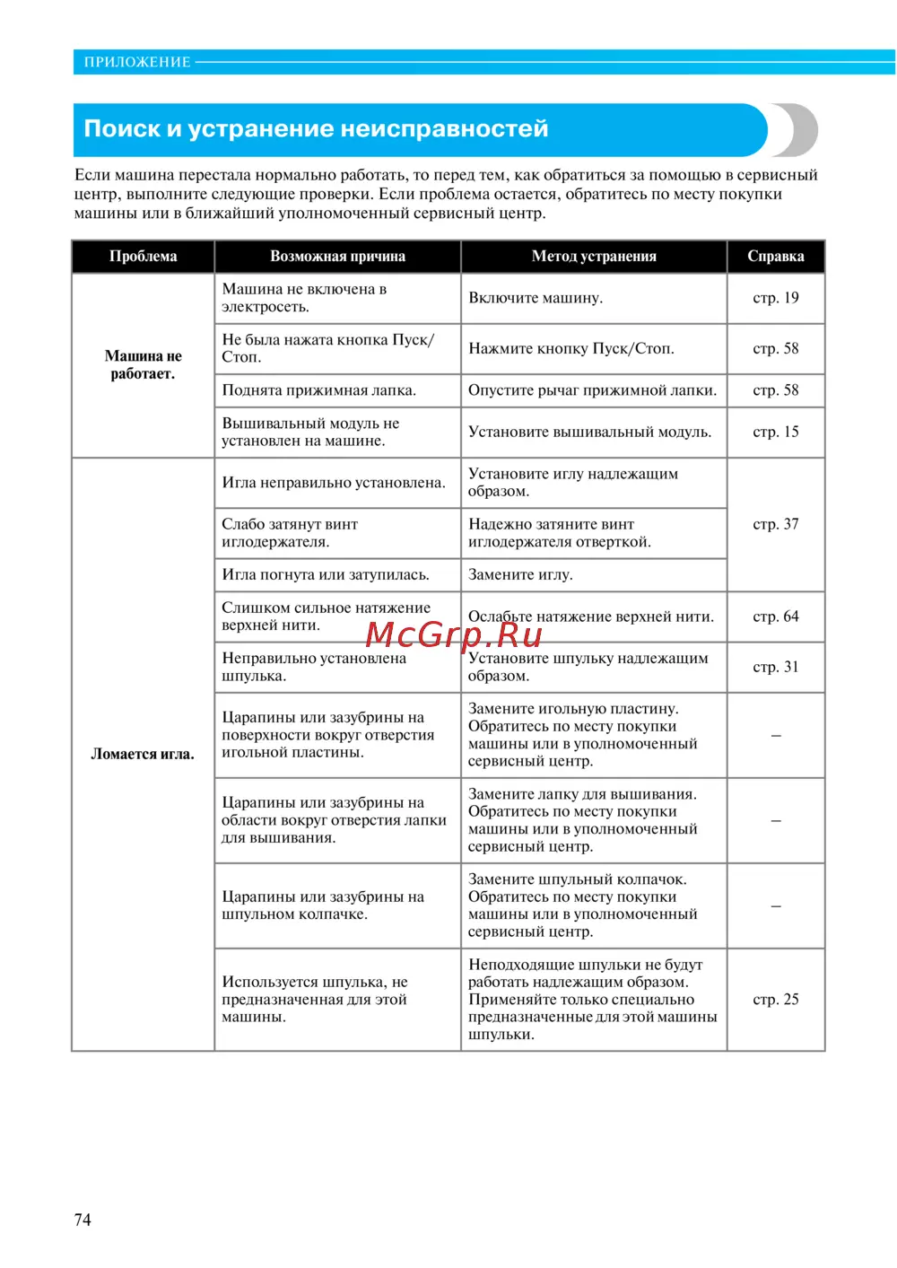 - Если машина перестала нормально работать то перед тем как обратиться за помощью в сервисный центр выполните следующие проверки если проблема остается обратитесь по месту покупки машины или в ближайший уполномоченный сервисный центр p.76