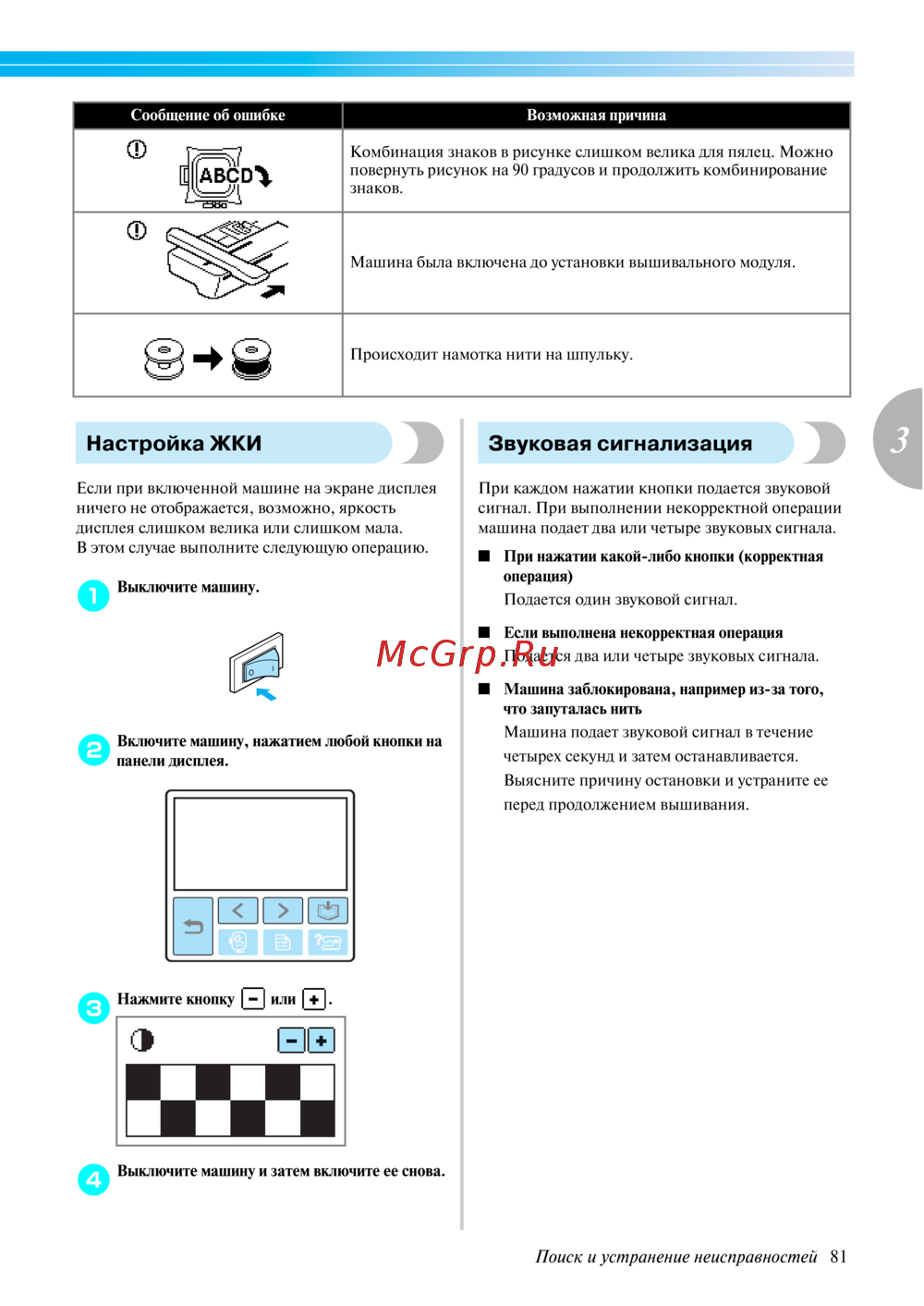 - Если машина перестала нормально работать то перед тем как обратиться за помощью в сервисный центр выполните следующие проверки если проблема остается обратитесь по месту покупки машины или в ближайший уполномоченный сервисный центр p.76