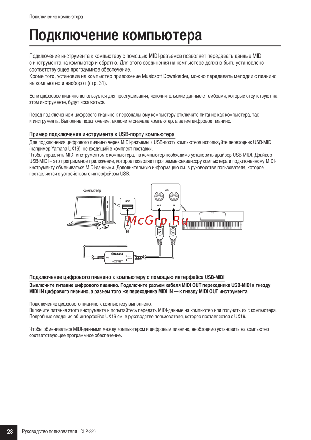 Подключение компьютера Подключение компьютера Подключение инструмента к компьютеру с помощью MIDI разъемов позволяет передавать данные MIDI с инструмента на компьютер и обратно Для этого соединения на компьютере должно быть установлено соответствующее программное обеспечение Кроме того установив на компьютер приложение Musicsoft Downloader можно передавать мелодии с пианино на компьютер и наоборот стр 31 Если цифровое пианино используется для прослушивания исполнительские данные с тембрами которые отсутствуют на этом инструменте будут искажаться Перед подключением цифрового пианино к персональному компьютеру отключите питание как компьютера так и инструмента Выполнив подключение включите сначала компьютер а затем цифровое пианино Пример подключения инструмента к USB порту компьютера Для подключения цифрового пианино через MIDI разъемы к USB порту компьютера используйте переходник USB MIDI например Yamaha UX16 не входящий в комплект поставки Чтобы управлять MIDI инструментом с компьютера на компьютер необходимо установить драйвер USB MIDI Драйвер USB MIDI это программное приложение которое позволяет программе секвенсору компьютера и подключенному MIDIинструменту обмениваться MIDI данными Дополнительную информацию см в руководстве пользователя которое поставляется с устройством с интерфейсом USB Подключение цифрового пианино к компьютеру с помощью интерфейса USB MIDI Выключите питание цифрового пианино Подключите разъем кабеля MIDI OUT переходника USB MIDI к гнезду MIDI IN цифрового пианино а разъем того же переходника MIDI IN к гнезду MIDI OUT инструмента Подключение цифрового пианино к компьютеру выполнено Включите питание этого инструмента и попытайтесь передать MIDI данные на компьютер или получить их с компьютера Подробные сведения об интерфейсе UX16 см в руководстве пользователя которое поставляется с UX16 Чтобы обмениваться MIDI данными между компьютером и цифровым пианино необходимо установить на компьютер соответствующее программное обеспечение 28 Руководство пользователя CLP 320