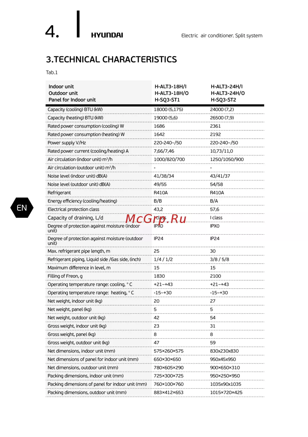 Capacity (cooling) BTU (kW) 18000 (5,175) 24000 (7,2)