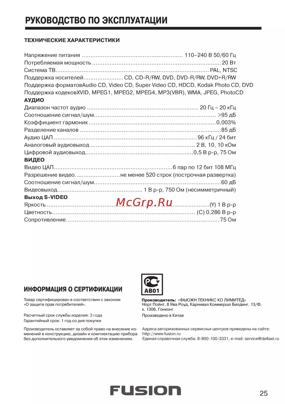 Fusion FD-U157X — технические характеристики видеопроигрывателей и аудиосистем [25/27]