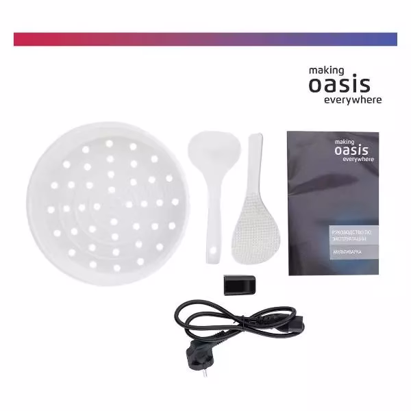 Комплектация книга рецептов, контейнер-пароварка, корзина для жарки, лопатка, столовая ложка для супа